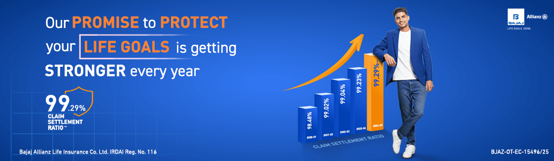 7Above illustration is for Bajaj Allianz Life iSecure - A Non-Linked Non-Participating Term Life Insurance Plan (UIN:116N109V05) considering Male aged 25 years | Non-Smoker | Policy Term (PT) – 10 years | Premium Payment Term (PPT) – 10 years | Sum Assured opted is ₹ 50,00,000 | Online Channel | Standard Life | Total Premium Paid is ₹ 1,17,340 | Medical Rates | Monthly Premium Payment Mode | Premium shown above is exclusive of Goods & Service Tax/any other applicable tax levied, subject to changes in tax laws, and any extra premium and is for illustrative purpose only.
