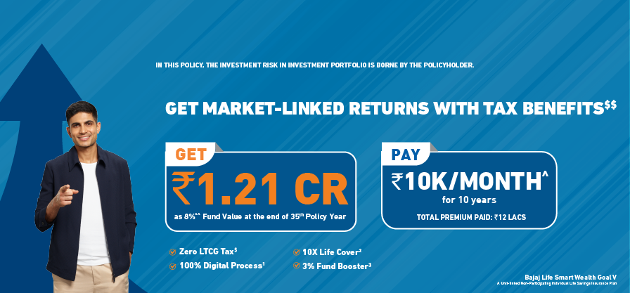 ULIPs are different from the traditional insurance products and are subject to the risk factors. The premium paid in ULIPs are subject to investment risks associated with capital markets and the NAVs of the units may go up or down based on the performance of fund and factors influencing the capital market and the insured is responsible for his/her decisions. Bajaj Life Insurance Limited is only the name of the Life Insurance Company and Bajaj Life Smart Wealth Goal V - A Unit-linked Non-Participating Individual Life Savings Insurance Plan (UIN: 116L201V04) is only the name of the unit linked insurance contracts and does not in any way indicate the quality of the contract, its future prospects or returns. Please know the associated risks and the applicable charges, from your Insurance agent or the Intermediary or policy document issued by the insurance company. The various funds offered under this contract are the names of the funds and do not in any way indicate the quality of these plans, their future prospects and returns.