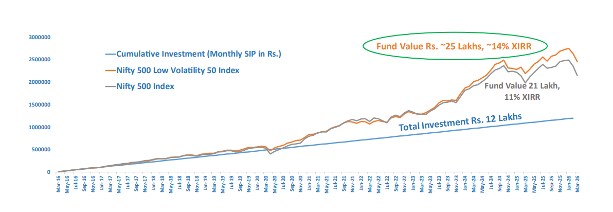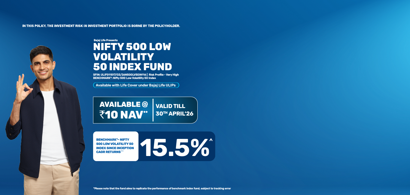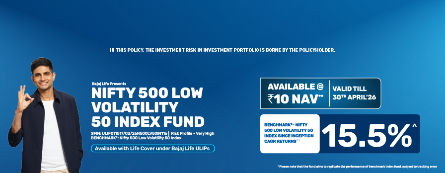 Nifty 500 Low Volatility 50 Index Fund is available with Bajaj Life Future Wealth Gain IV - A Unit- linked Non- Participating Individual Life Savings Insurance Plan (UIN:116L202V01), Bajaj Life Goal Assure IV - A Unit-linked Non-Participating Individual Life Savings Insurance Plan (UIN: 116L204V01), Bajaj Life LongLife Goal III is A Unit-linked Non-Participating Whole Life Insurance Plan (UIN:116L203V01), Bajaj Life Invest Protect Goal III - A Unit-linked Non-Participating Individual Life Savings Insurance Plan (UIN: 116L205V01), Bajaj Life Magnum Fortune Plus III - A Unit-linked Non-Participating Individual Life Savings Insurance Plan (UIN: 116L207V02), Bajaj Life Goal Based Saving III - A Unit-linked Non-Participating Individual Life Savings Insurance Plan (UIN:116L206V01), Bajaj Life Fortune Gain II- A Unit-linked Non Participating Individual Life Savings Insurance Plan (UIN- 116L196V04), Bajaj Life Smart Wealth Goal VI - A Unit-linked Non-Participating Individual Life Savings Insurance Plan (UIN:116L214V01), Bajaj Life GAIN -A Unit- Linked Non- Participating Individual Life Savings Insurance Plan (UIN:116L213V02), Bajaj Life Supreme- A Unit- Linked Non- Participating Individual Life Savings Insurance Plan (UIN:116L211V02)