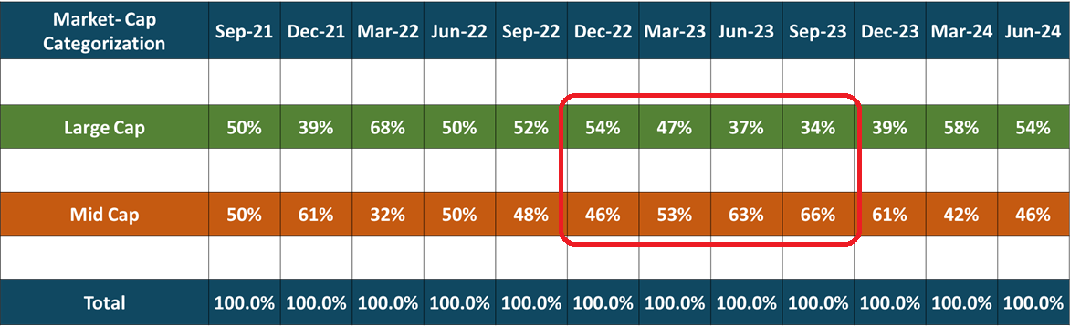 • Recent market correction leads to increase allocation in Large Cap to 58% in Mar’24 vs 39% in Dec’23
