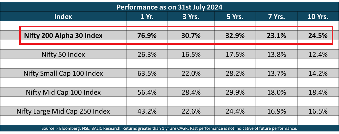 • Nifty 200 Alpha 30 Index has delivered 76.9% return over the last one year, helped by market buoyancy & momentum (esp. in mid cap stocks).