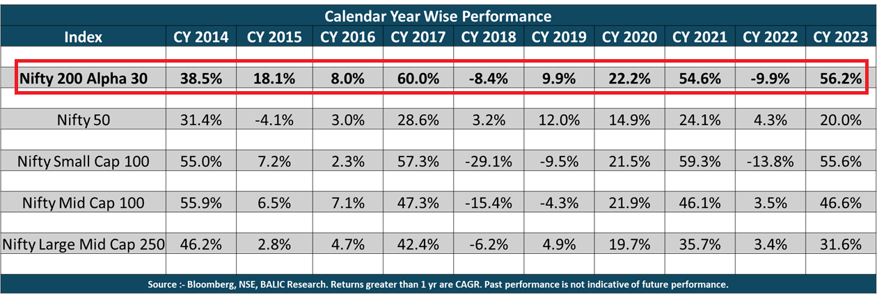 • Nifty 200 Alpha 30 Index has outperformed the Nifty 50 index in 7 out of last 10 calendar years