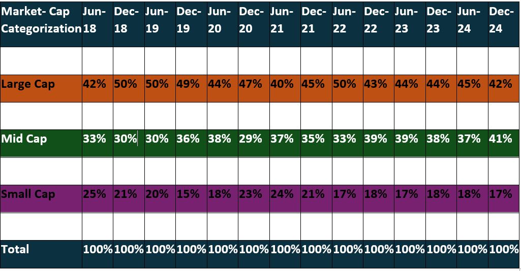 • In the last 6.5 years, the half-yearly average allocation among Large Cap, Mid Cap, and Small Cap stocks has been 45%, 35%, and 20%, respectively, indicating a diversified allocation.