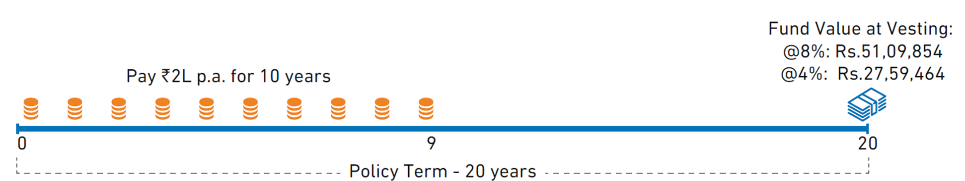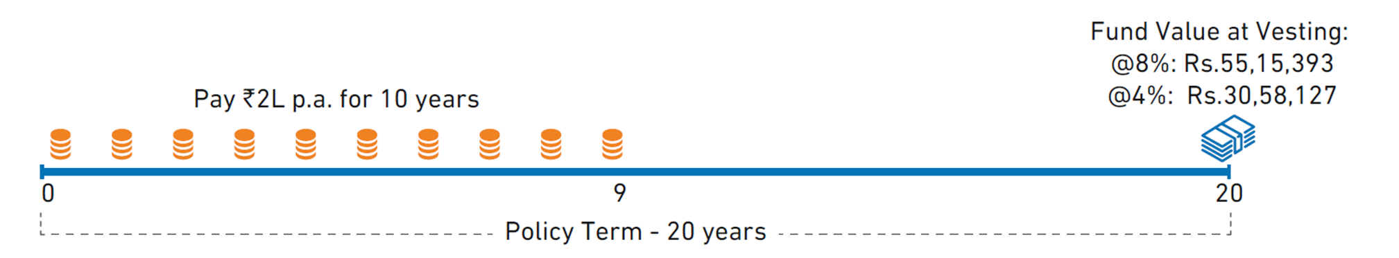 Mr. Sumit aged 40 years, an investment banker, wants to save for his retirement which is expected in the next 20 years. He wants a plan that provides market-linked returns that builds sufficient corpus for his retirement needs. He decides to purchase Bajaj Life Smart Pension (Variant 1: Classic). He paid the premium of Rs.2,00,000 p.a. for a period of 10 years with policy term of 20 years. The total premium that will be paid by him throughout the policy term will be Rs. 20,00,000.