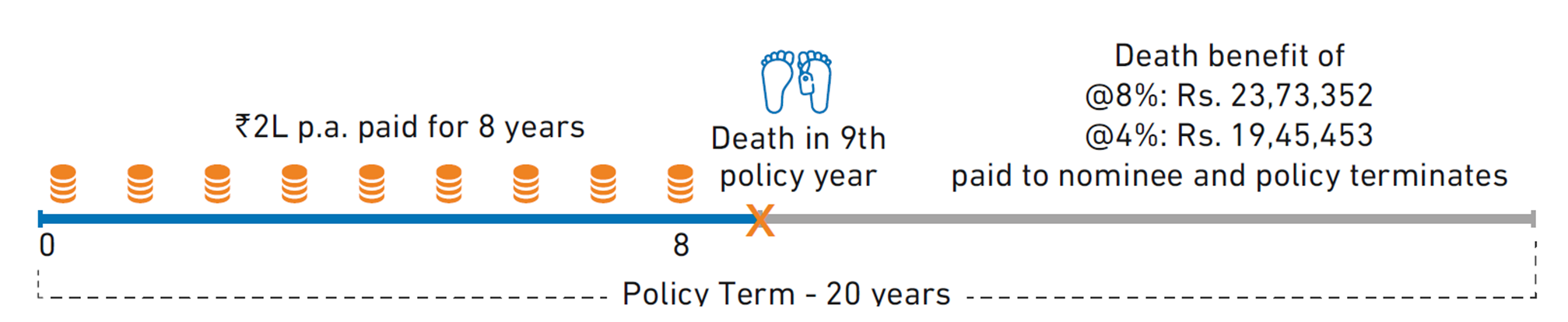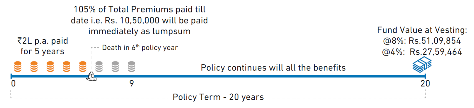 Under Variant 2: Assure, Waiver of Premium benefit ensures your policy continues uninterrupted in event of life assured’s unfortunate demise.