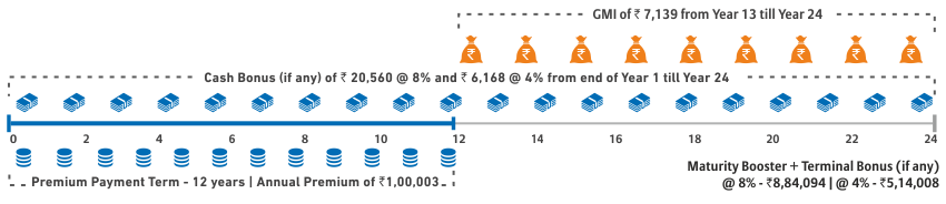 #Sum Assured on Death is higher of the sum assured or 10 times of Annualized Premium*, further the death benefit plus Cash Bonus paid out will not be less than 105% of Total Premiums* paid