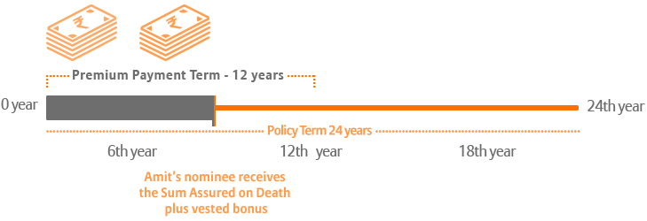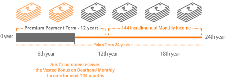In the unfortunate event of the death of the life assured, the vested bonus plus terminal bonus, if any, is paid immediately. Further, the nominee will get the sum assured over the next 144 months in equated monthly instalments (i.e. over the next 12 years) and the first instalment will start from the date of death.